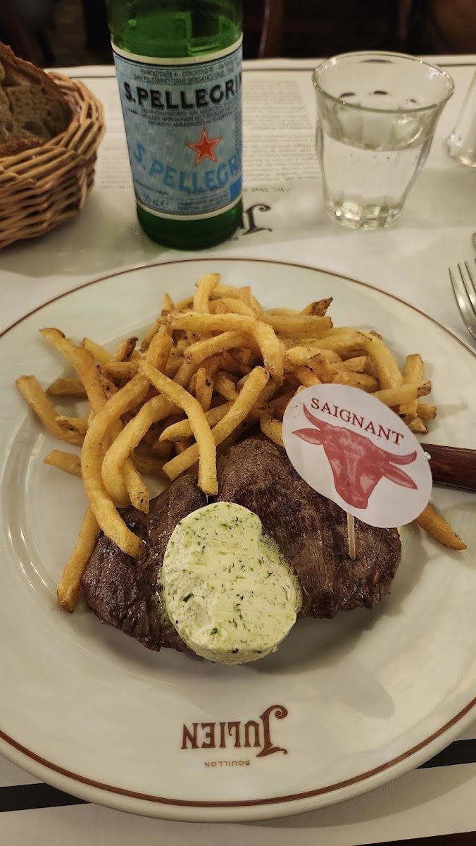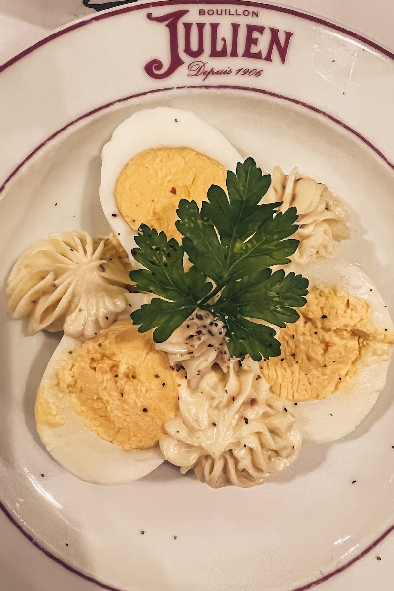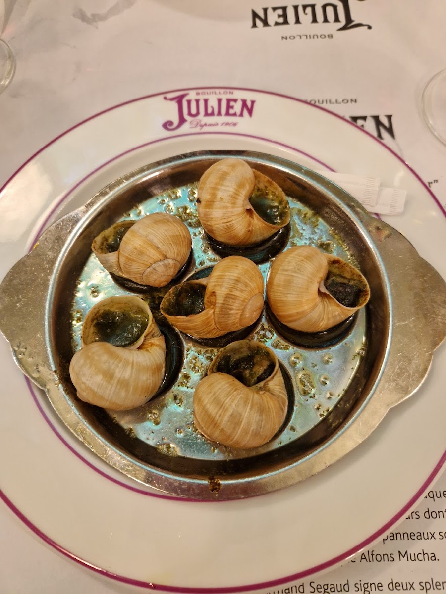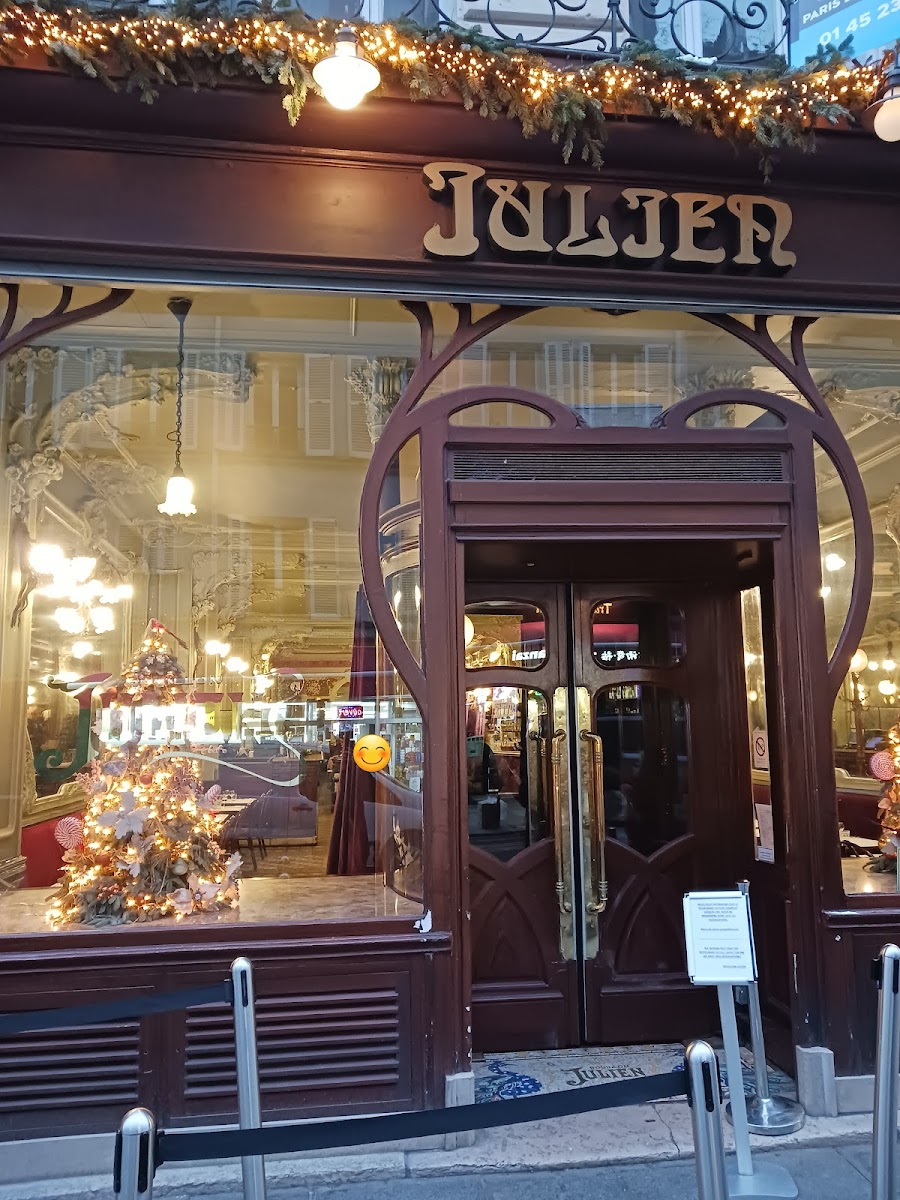 A Timeless Parisian Experience at Bouillon Julien If you're looking for a truly Parisian dining experience, Bouillon Julien is an absolute gem. The interior is nothing short of breathtaking — ornate mirrors, intricate plasterwork, stained glass ceilings, and elegant murals create an atmosphere that feels both historic and romantic. It's like dining inside a work of art. The food was exactly what you'd hope for in a classic French bistro — authentic, comforting, and delicious. I ordered the escargots, which were perfectly cooked and served with a fragrant garlic and herb butter. Rich, flavorful, and so satisfying. I also had the French onion soup, which was incredibly tasty — deeply caramelized onions, a rich broth, and that perfect cheesy crouton topping. Simple dishes, done exactly right. On top of all this, the prices were very reasonable, especially considering the location, quality, and ambience. It's the kind of place where you can enjoy traditional French cuisine without breaking the bank. Whether you're a tourist looking for an iconic Parisian meal or a local wanting a reliable spot for comfort food, Bouillon Julien delivers on every level. Can’t recommend it enough.